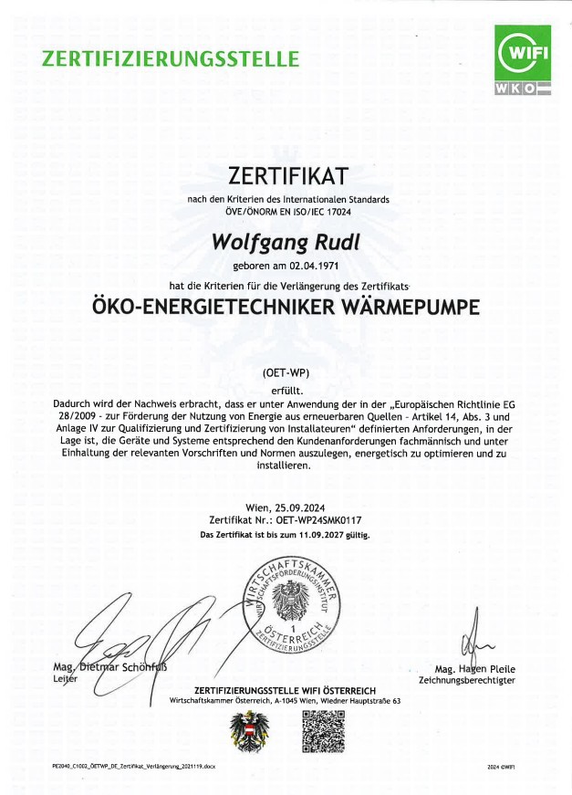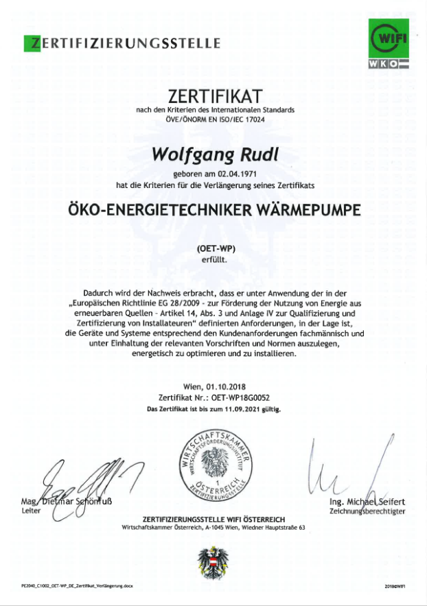 Als zertifizierter ÖKO-Energietechniker versichern wir Ihnen Wärmepumpenanlagen, unter Einhaltung aller relevanten Vorschriften und Normen, fachmännisch und energetisch optimal zu installieren.